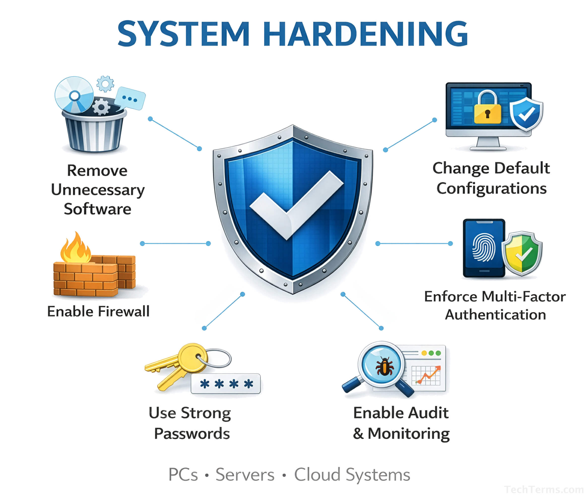System hardening is the process of reducing security vulnerabilities by removing unnecessary software, services, and system access points. The goal is to make a computer as secure as possible while preserving the functionality it needs to operate.